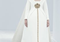 Ở màn kết của buổi trình diễn, người mẫu Ashleigh Good trong trang phục váy cưới khoác lên mình tấm áo choàng dạng cape (áo choàng không tay) tuyệt đẹp được thêu tay kỳ công họa tiết Baroque tinh xảo – thể hiện sự ưu ái của NTK Karl Lagerfeld đối với người phụ nữ bầu bí.