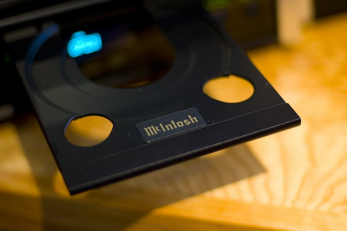 Trung tâm của bộ dàn là ampli tích hợp với đầu đọc SACD/CD theo kiểu nuốt đĩa, được chia cách điệu thành 2 khối riêng biệt. Đồng hồ công suất màu xanh và 2 phím chức năng (chọn nguồn vào và volume) của ampli chính là những biểu tượng giúp các audiophile dễ dàng nhận diện sản phẩm McIntosh.