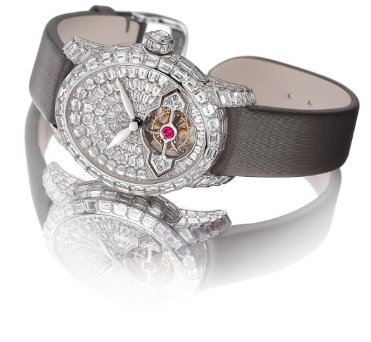 Hãng đồng hồ nổi tiếng Thụy Sĩ vừa ra mắt Cat’s Eye Tourbillon Haute Joaillerie – Đồng hồ mắt mèo trục cuốn xoay trang sức cao cấp. Đồng hồ làm bằng vàng trắng 18K, trên thân có nạm 155 viên kim cương với tổng trọng lượng là 12,97 carat. Mặt đồng hồ nạm 106 viên kim cương, tổng trọng lượng 4,2 carat và núm xoay có 12 viên kim cương với tổng trọng lượng 0,58 carat.