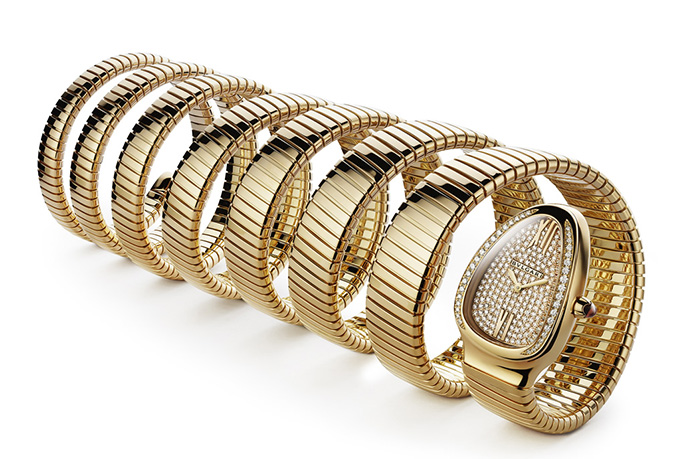 Bulgari Serpenti 7 Coils với thiết kế giống như một con rắn uốn lượn xung quanh cánh tay của người đeo. Phần thân rắn gồm 7 vòng cuộn quanh tay bằng vàng hồng, dài 1.1m và có thể mở rộng tùy theo kích cỡ của cánh tay, cùng với đó là 228 viên kim cương