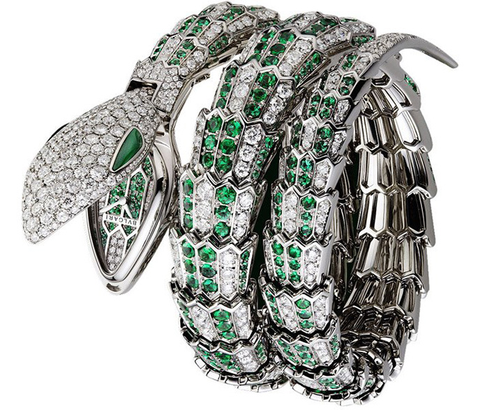 Đồng hồ Bulgari Serpenti Haute Joaillerie nằm trong bộ sưu tập Serpentine với 386 viên kim cương và 388 viên ngọc lục bảo ở trên vòng đeo tay và mặt đồng hồ