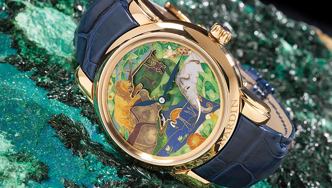 Đồng hồ độc đáo Ulysse Nardin Safari Jaquemarts Minute Repeater với mặt đồng hồ có các hình 3 chiều: hình một con cá nhỏ đang nằm trong hàm cá sấu, hình con khỉ, voi và sư tử.