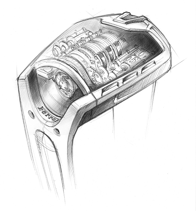 Giờ và phút được hiển thị ở phía tay phải của bộ máy hoạt động, còn bên trái là mặt hiển thị cho biết thời gian dự trữ năng lượng còn lại, cả hai đều được làm bằng chất liệu nhôm đen. Mỗi mặt hiển thị đều có hình dáng của 1 chiếc xi-lanh trong ô tô và cùng được phủ một lớp siêu dạ quang SuperLuminova.