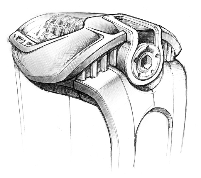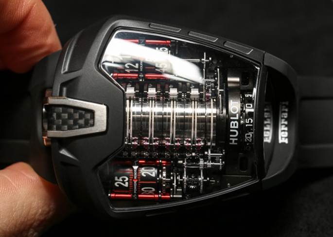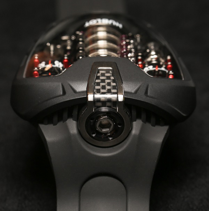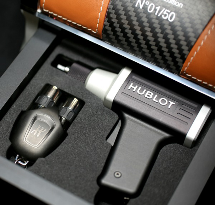 Hệ thống điều chỉnh thời gian được đặt ở giữa mặt bên dưới của vỏ đồng hồ (bên cổ tay). Không chỉ vậy, Hublot còn tặng kèm khách hàng một số vật dụng bao gồm tua-vít điện tử nhỏ và bộ công cụ chỉnh bộ máy hoạt động và thiết lập đồng hồ. Với bộ công cụ này, khách hàng có thể lên dây cót của đồng hồ bởi đồng hồ hoạt động bằng bộ máy lên dây bằng tay.