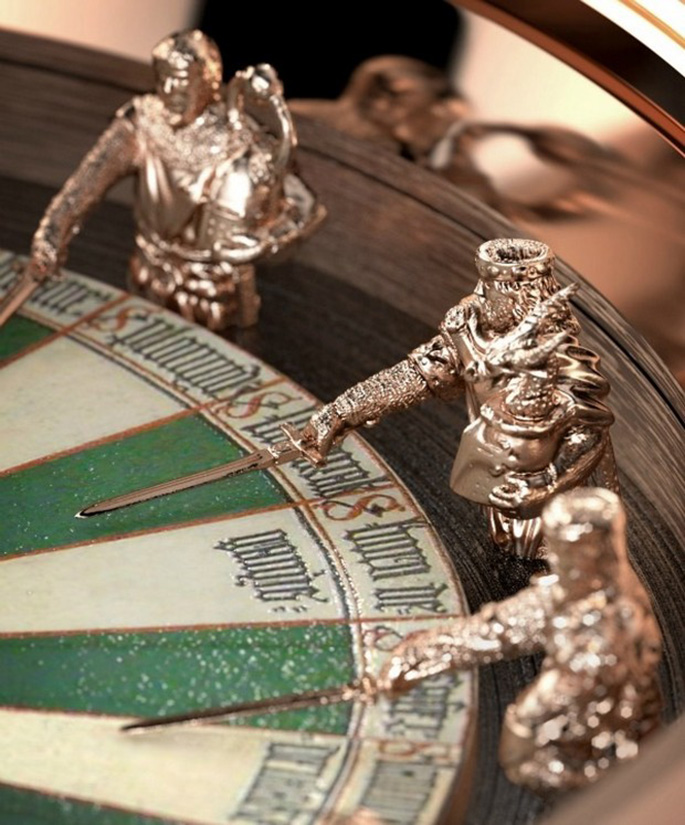 Mặt đồng hồ Excalibur Table Ronde có sự xuất hiện của 12 hiệp vị với thanh gươm của mình, tượng trưng cho 12 giờ, được làm bằng vàng và sắp xếp xung quanh mặt đĩa bằng men (đại diện cho Bàn tròn).