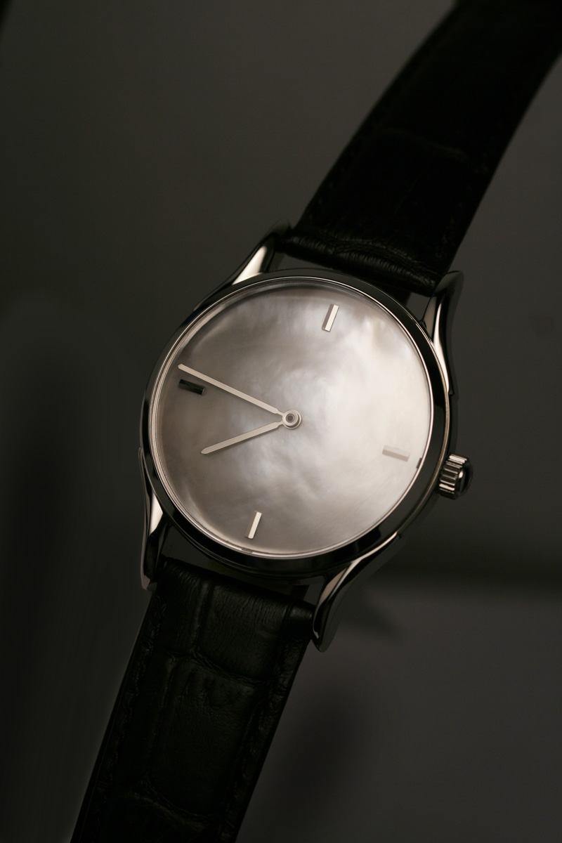 Chiếc đồng hồ cá nhân của tôi là loại đồng hồ cổ điển, có đường kính 36mm với mặt đồng hồ làm từ vỏ trai nguyên khối, kim cương được gắn trên vạch chỉ giờ với bộ máy cổ lên dây bằng tay.
