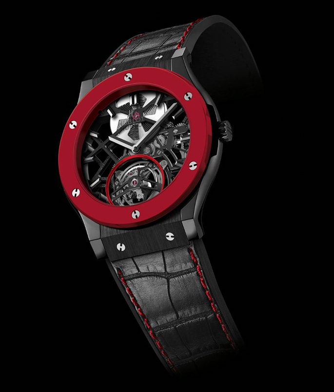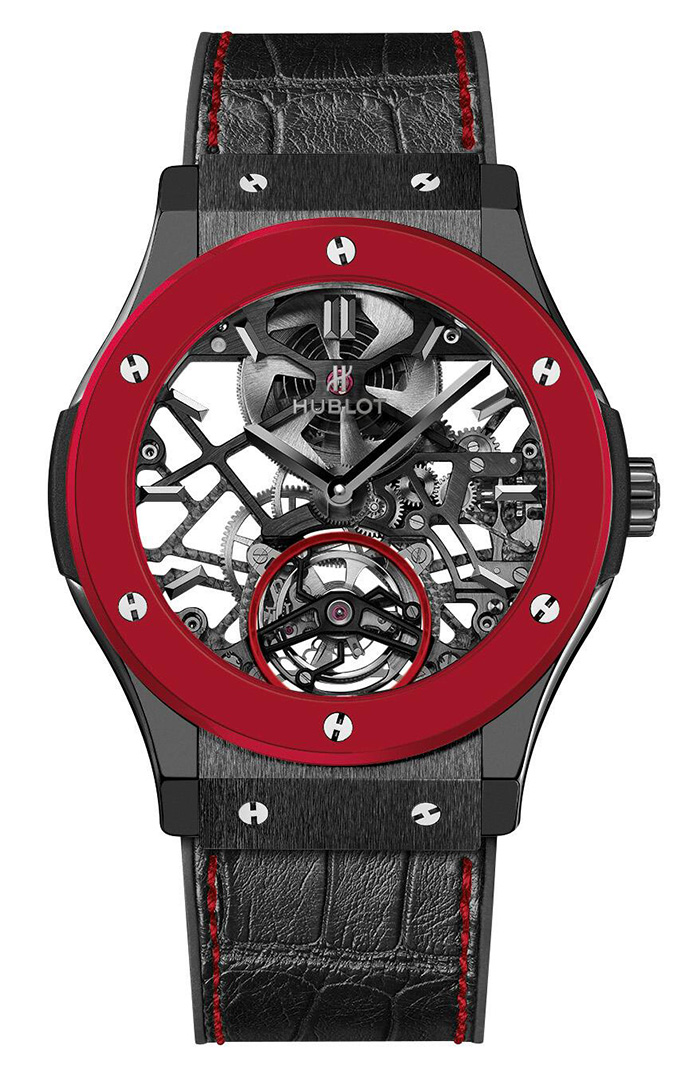 Đến với sự kiện Only Watch năm nay, Hublot sẽ trình làng tới khách hàng đồng hồ Red’n’Black Skeleton Tourbillon. Đây là mẫu đồng hồ có vỏ được làm bằng gốm màu đen, đường kính 45mm, có khả năng chịu áp lực nước dưới độ sâu 30m.