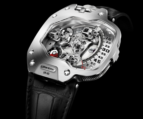 Thiết kế quả là phức tạp và tất nhiên là không giống ai. Chưa hết, Urwek 110 còn có thêm một đồng hồ “oil change” chỉ thời điểm cần “ăn dầu”. Tuy nhiên không thường xuyên như với xe hơi, chỉ cần 3 năm thay một lần. Urwek UR 110 có hai phiên bản, vỏ titanium sáng bạc và titanium đen.