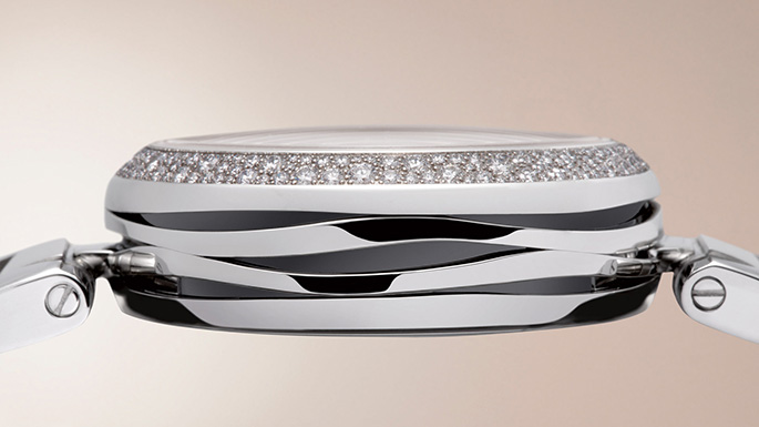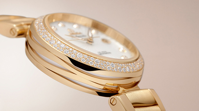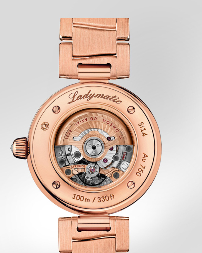 OMEGA De Ville Ladymatic có vỏ được làm bằng vàng đỏ 18K hoặc thép không gỉ, đường kính 34mm, có khả năng chịu áp lực nước dưới độ sâu 100m. Xung quanh mặt đồng hồ đều được đính kim cương, mặt số cũng được thay thế bằng 11 viên kim cương.