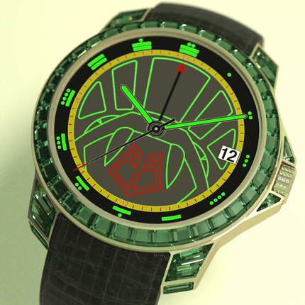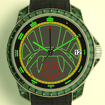 Chiếc đồng hồ được làm bằng vàng trắng 18K và trang trí toàn bộ bằng ngọc lục bảo cắt theo hình baguette (chữ nhật). Vỏ đồng hồ có đường kính 47mm với độ dày 14mm. Những viên ngọc lục bảo được lắp xung quanh viền đồng hồ và các vấu lồi – loại ngọc này được đảm bảo có xuất xứ từ Brazil hoặc Colombia.