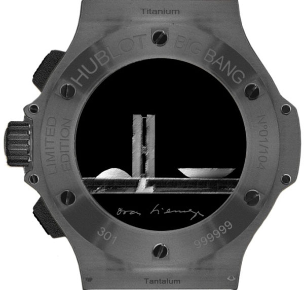 Việc ra đời loạt đồng hồ mới cũng nhằm vinh danh kiến trúc sư Oscar Niemeyer – người đã xây dựng một thành phố mang phong cách kiến trúc vị lai – biểu tượng của một Brazil hiện đại. Thành phố Brasilia chính là công trình nổi tiếng nhất của Niemeyer khiến ông trở thành một trong những kiến trúc sư vĩ đại nhất của thế kỷ 20. Oscar Niemeyer đã đồng ý hợp tác với Hublot tạo ra loạt đồng hồ kỷ niệm sinh nhật lần thứ 104 của Brasilia mang tên “Aero Bang Niemeyer” – được sản xuất với số lượng hạn chế 104 chiếc.