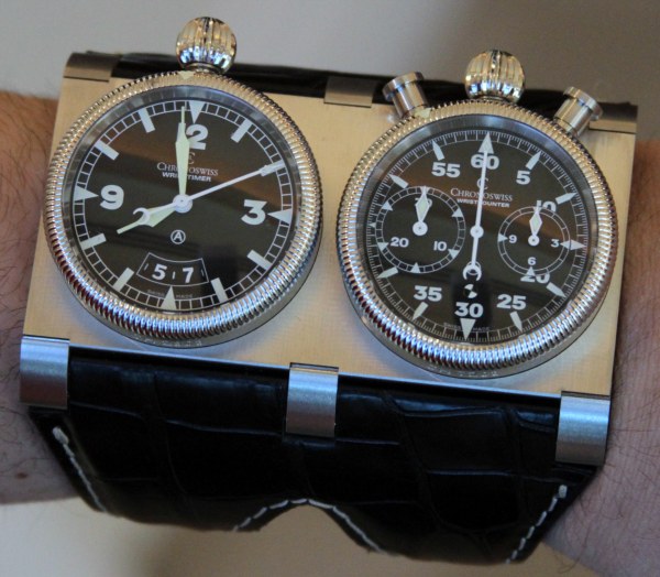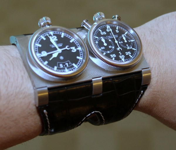 2 chiếc đồng hồ thép được lắp vào khung thép gắn với hệ dây đeo đôi. Chiếc đồng hồ có kích thước 84mmx42mmx20mm. Với kích thước lớn như vậy, nó ôm gần như hết cẳng tay thay vì vắt ngang qua cổ tay như những chiếc đồng hồ thông thường.