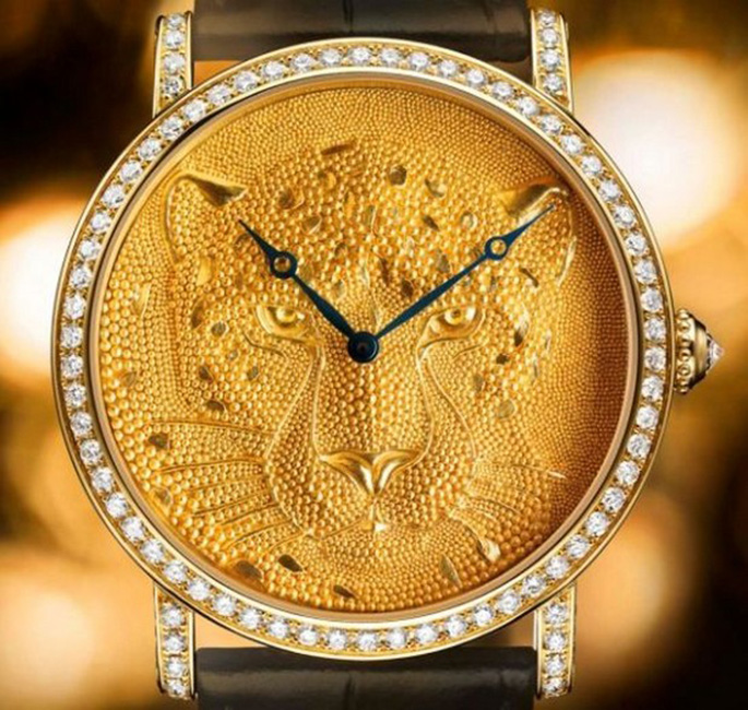 Núm đồng hồ cũng được làm bằng vàng 18K với 1 viên kim cương gắn bên trên. Mặt đồng hồ có hình con báo, đươc tạo và đính hoàn toàn bằng tay từ những hạt vàng 18K. Đây chính là điểm nổi bật chính của đồng hồ, giúp cho khách hàng có thể chiêm ngưỡng vẻ đẹp lấp lánh của đồng hồ từ bất kỳ góc độ nào.