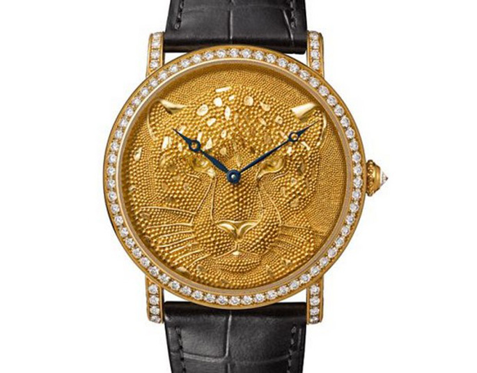 Rotende de Cartier 42mm “Báo và hạt” là đồng hồ thuộc dòng Cartier d’Art, có vỏ được làm bằng vàng vàng 18K, đường kính mặt đồng hồ 42mm. Xung quanh viền vỏ đồng hồ được đính 306 viên kim cương cắt kiểu brilliant (tổng cộng nặng 3,63 carat).