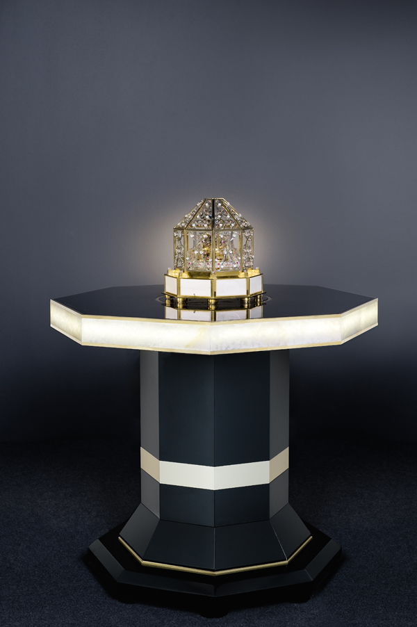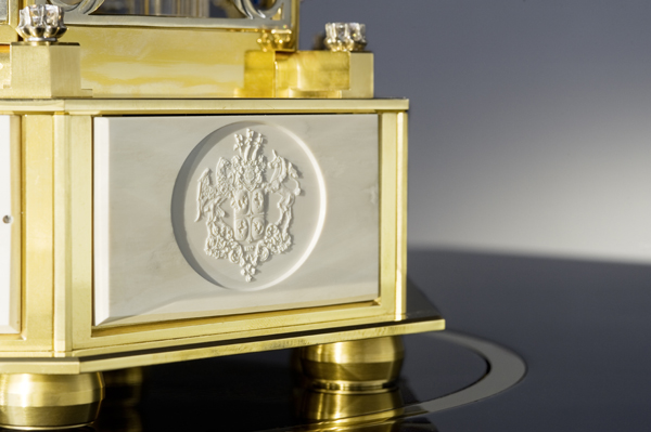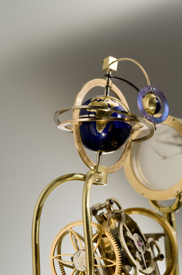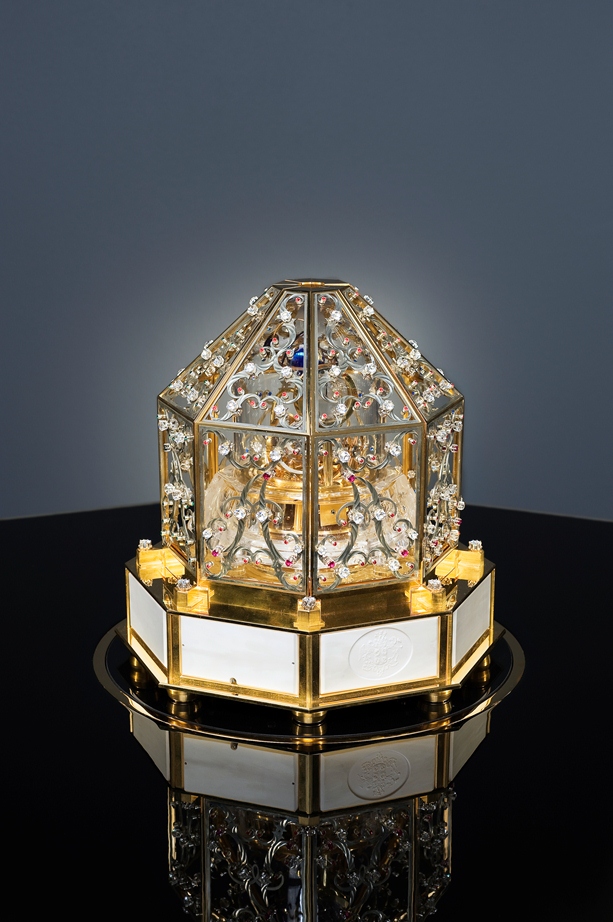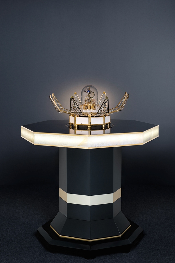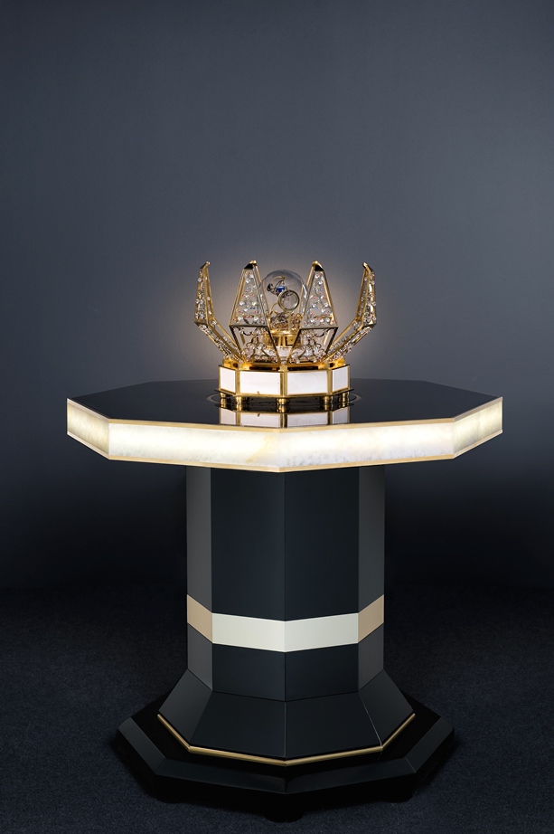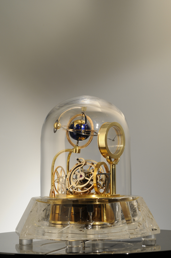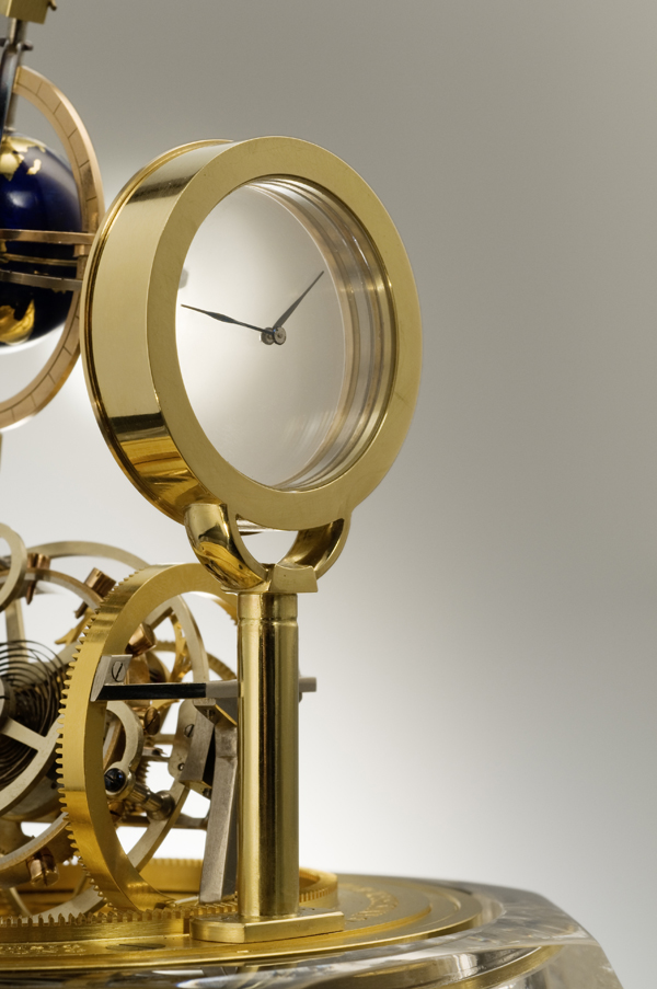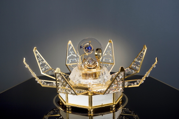 Chiếc đồng hồ tuyệt đẹp này có kết cấu mô phỏng các hành tinh với trái đất, mặt trăng và mặt trời là trung tâm được bảo vệ bởi một lồng kính trong suốt. Những cánh hoa pha lê lấp lánh xung quanh càng làm cho “bí ẩn của thời gian” thêm lộng lẫy, khẳng định sự tài hoa của các người thợ châu Âu.