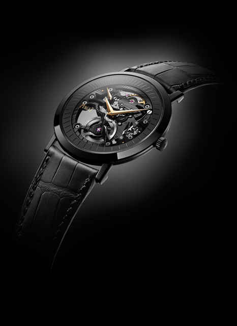 Đồng hồ siêu mỏng có vỏ bằng vàng đen hoàn thiện theo công nghệ PVD, mặt đồng hồ cắt skeleton cho người dùng cảm nhận được hoạt động của từng chi tiết máy.