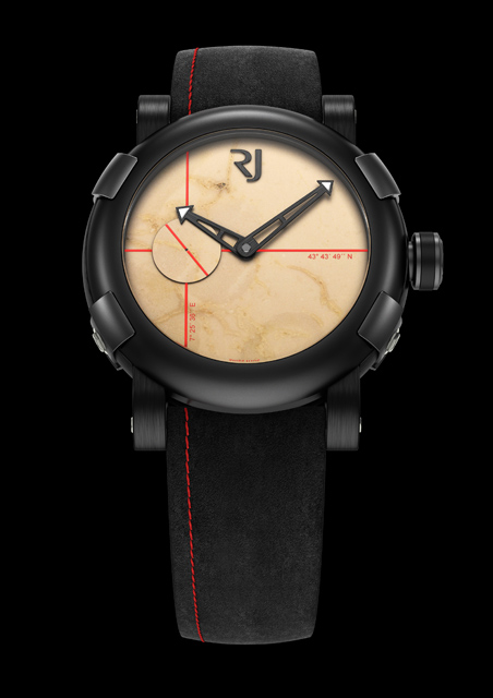 Đồng hồ lên dây tự động có vỏ bằng thép không gỉ và titanium được xử lý PVD, mặt đồng hồ được làm bằng đá Monaco với thiết kế đường màu đỏ có in kinh độ của Monaco.