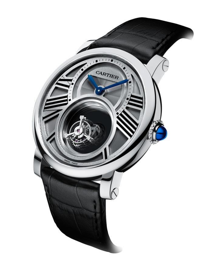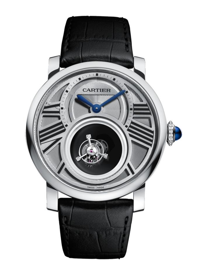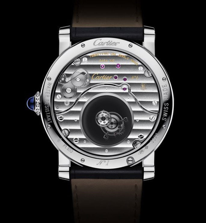 Cartier Rotonde Double Mystery Tourbillon có vỏ được làm bằng platin, đường kính 45mm, chịu áp lực nước dưới độ sâu 30m. Dây đeo đồng hồ được làm bằng da cá sấu màu đen với khóa bằng vàng trắng 18K.