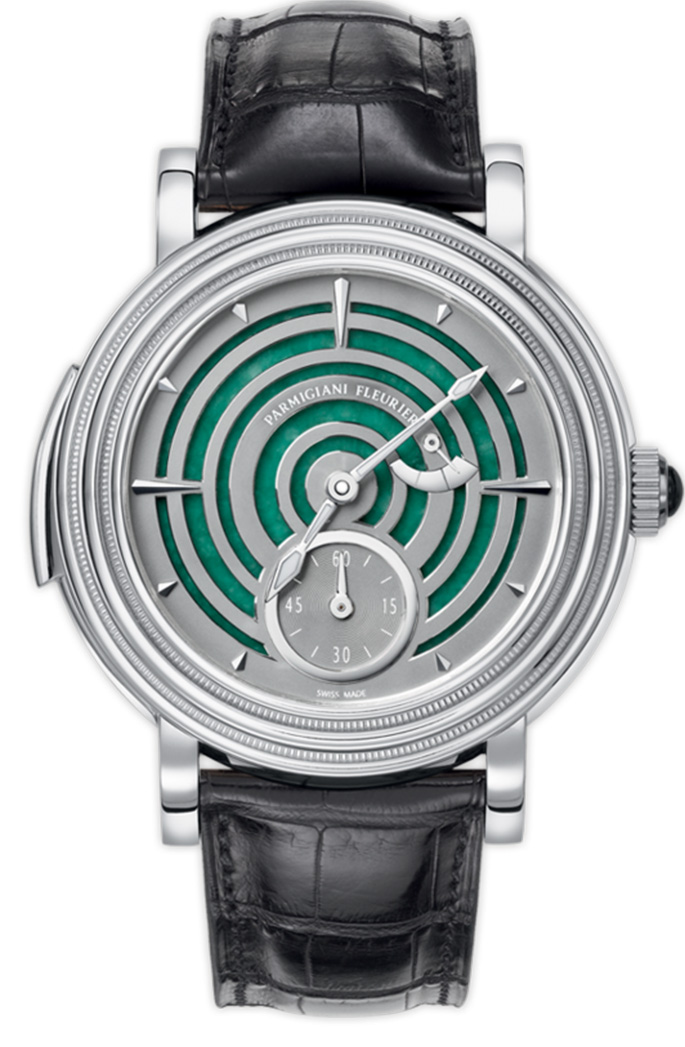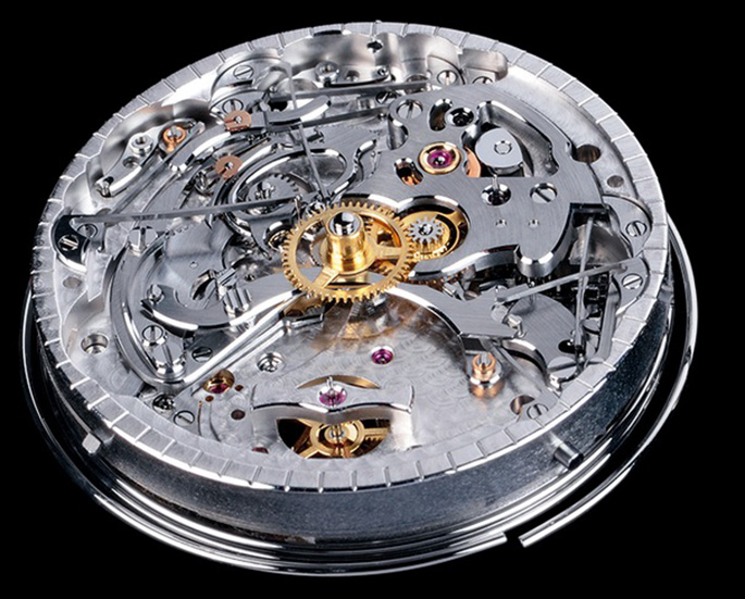 Không chỉ vậy, mặt đồng hồ được tạo từ 2 lớp đĩa: một đĩa màu xanh ngọc Miến Điện và một đĩa được làm bằng vàng trắng với các khe hở hình vân đồng tâm. Đồng hồ hoạt động bằng bộ máy minute repeater lên dây bằng tay, 35 hạt chân kính, dự trữ năng lượng trong 72 giờ.