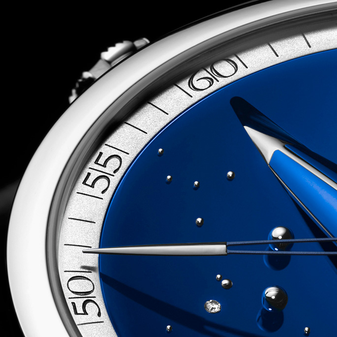 De Bethune DB28 Skybridge có thiết kế đầy bắt mắt với bầu trời màu xanh bằng titan huyến bí và những ngôi sao bằng kim cương. Kim đồng hồ được làm bằng thép màu xanh và được đánh bóng.