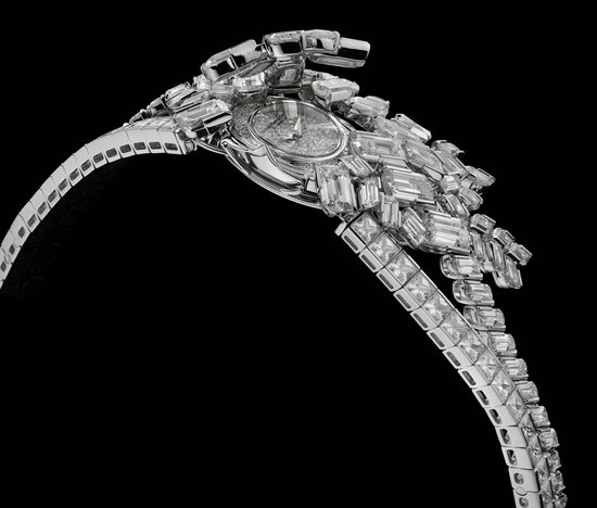 Những viên đá quý bao phủ và che đậy mặt trên của đồng hồ một cách linh động, khi mở ra nó cho thấy vẻ đẹp tuyệt vời của vàng trắng kết hợp cùng những viên kim cương phủ quanh bộ máy đồng hồ. Ánh sáng rực rỡ sẽ được tỏa ra từ 77 viên kim cương do những người thợ khéo léo cắt, sắp đặt và kết nối một cách hoàn toàn thủ công.