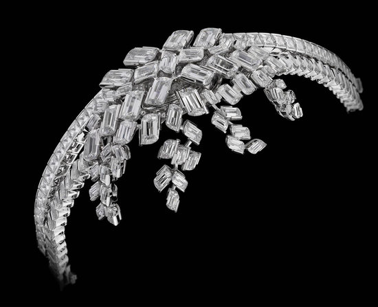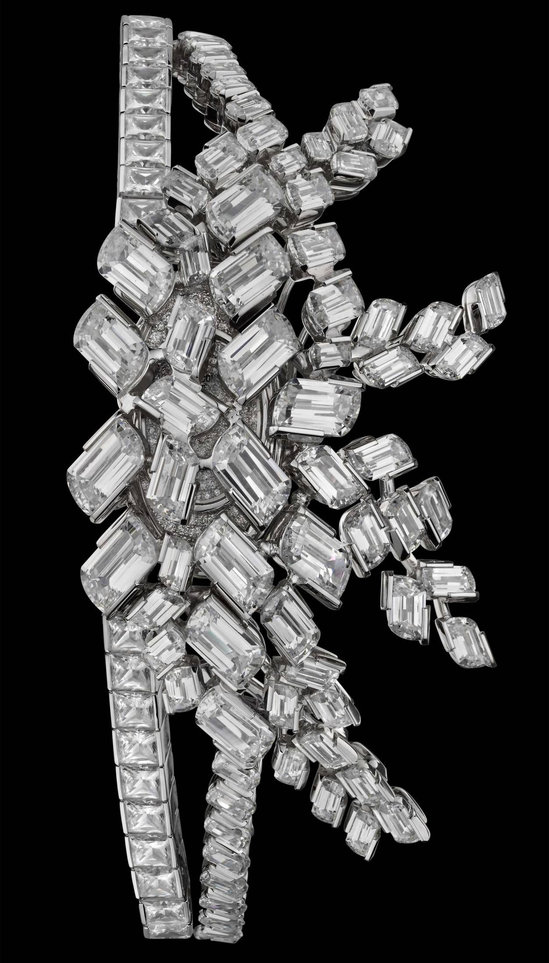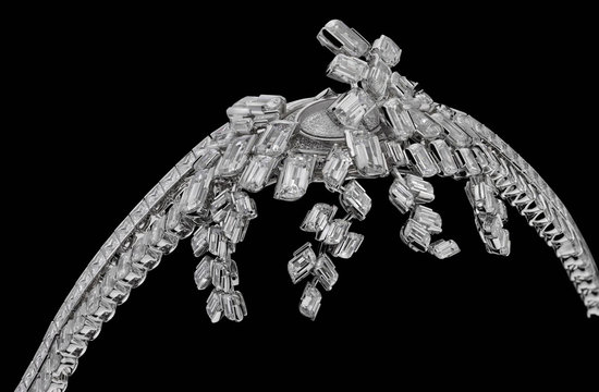 Dây đeo là vàng trắng 18K kết hợp với 29 viên kim cương cắt bóng có tổng trọng lượng 4 carat cùng 39 viên kim cương cắt chữ nhật kiểu princess-cut tổng trọng lượng 8,2 carat.