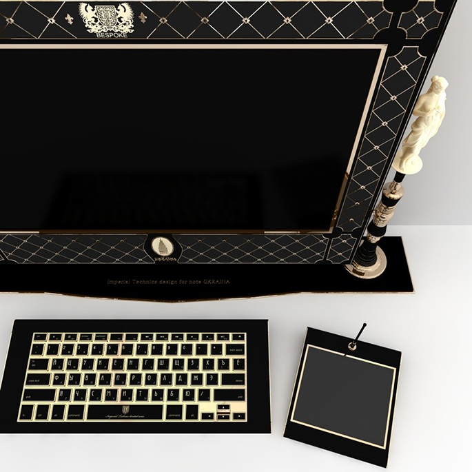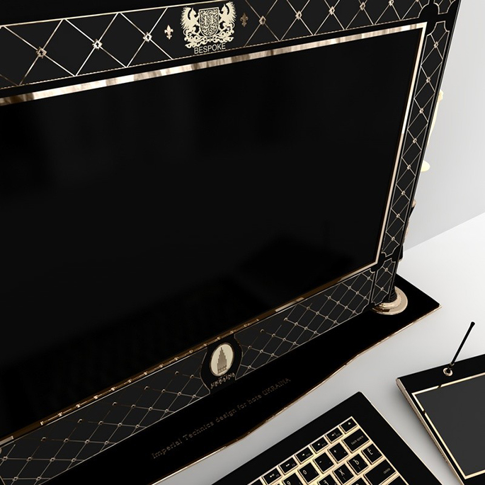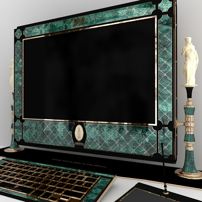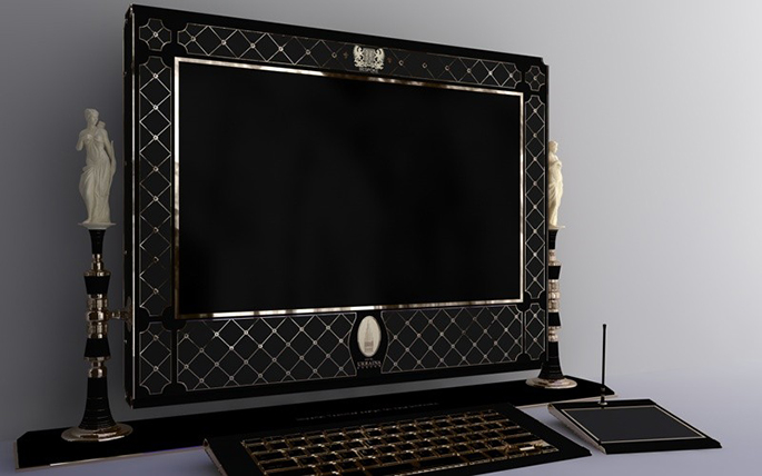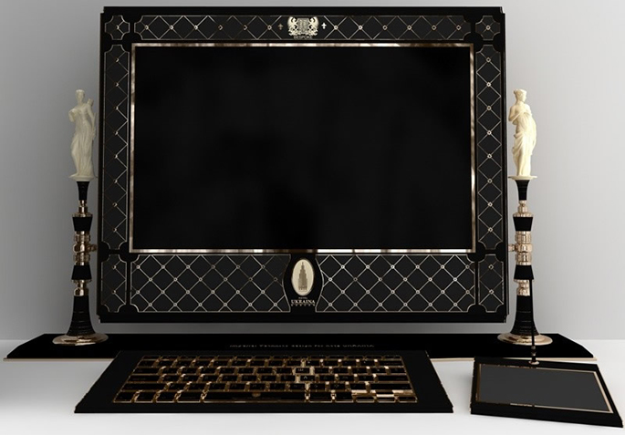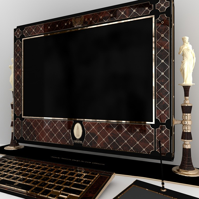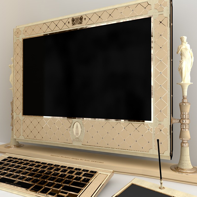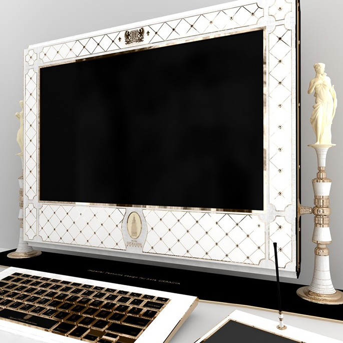 Được làm từ nhiều loại vật liệu quý khác nhau như Swarovski, crôm, vàng nguyên chất 24K… Vỏ nguyên bản của iMac được thay thế bằng mã não được làm hoàn toàn thủ công, trong khi màn hình được làm từ ngà voi.