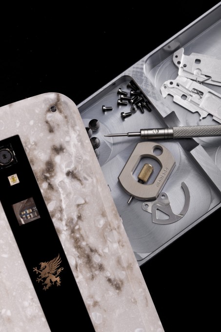 Không dừng lại ở đó, Grand Touch Executive còn giới thiệu một cơ chế mới, mà Mobiado gọi là chìa khóa của sự sáng tạo. Đó là một thiết bị cơ khí đi kèm, cho phép mở khay đựng SIM và khoe ra một phần kết cấu bên trong của điện thoại.
