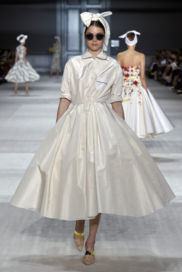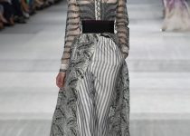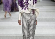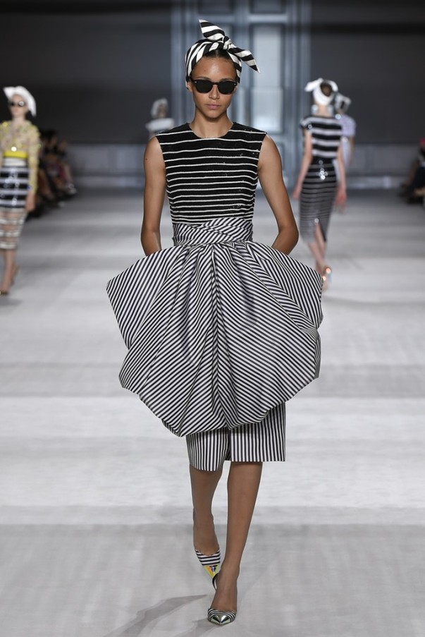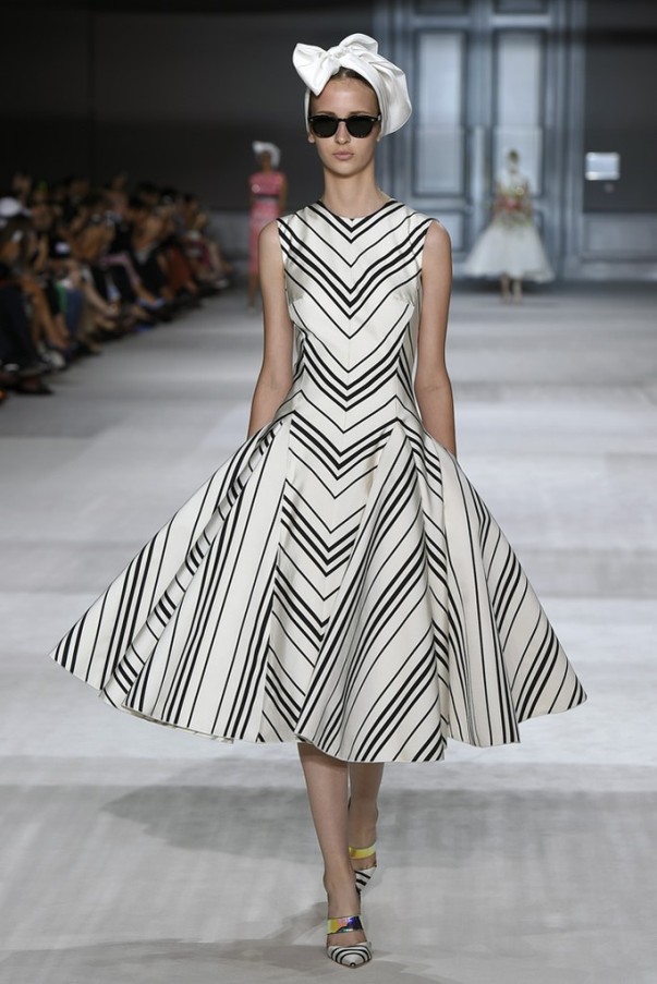 Trong vòng một bộ sưu tập (BST), Giambattista Valli đã đưa khán giả từ bất ngờ này đến bất ngờ khác. Đều là kẻ sọc nhưng mỗi bộ trang phục lại có một kiểu riêng nhờ sự sự kết hợp linh hoạt với những chiếc nơ to bản rủ và các đường cắt quyến rũ mà kín đáo, thanh lịch. Với cảm hứng từ những bộ pyjama một màu (monochrome), Valli gợi lên hình dung cô nàng ngái ngủ “quấn vội” chiếc khăn lên đầu, thư thái dạo chơi trong khu vườn Alhambra thơ mộng.