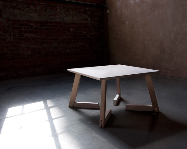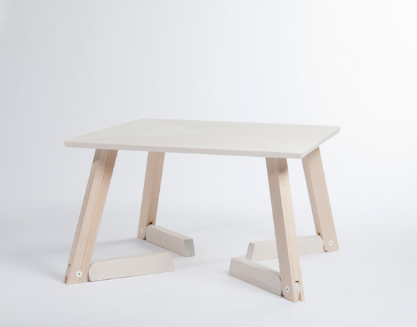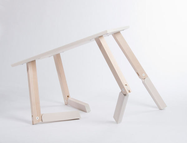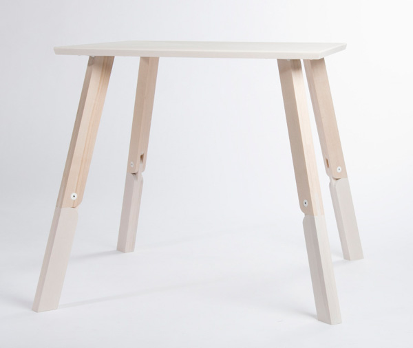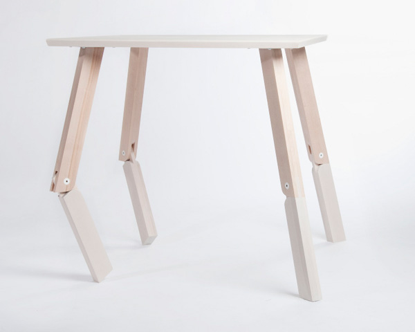 Bàn Bambi với thiết kế chân bàn mô phỏng đầu gối, có thể gập lại để người dùng sử dụng ở hai chiều cao khác nhau. Khi gập lại, chiếc bàn gợi nhắc đến chú nai con hoạt hình nổi tiếng. Chất liệu: Gỗ bu-lô và thép sơn. Chiều cao khi dựng chân bàn là 74cm, khi gập chân là 45cm. – Ảnh: Linn Vandli