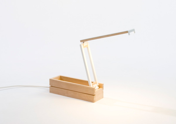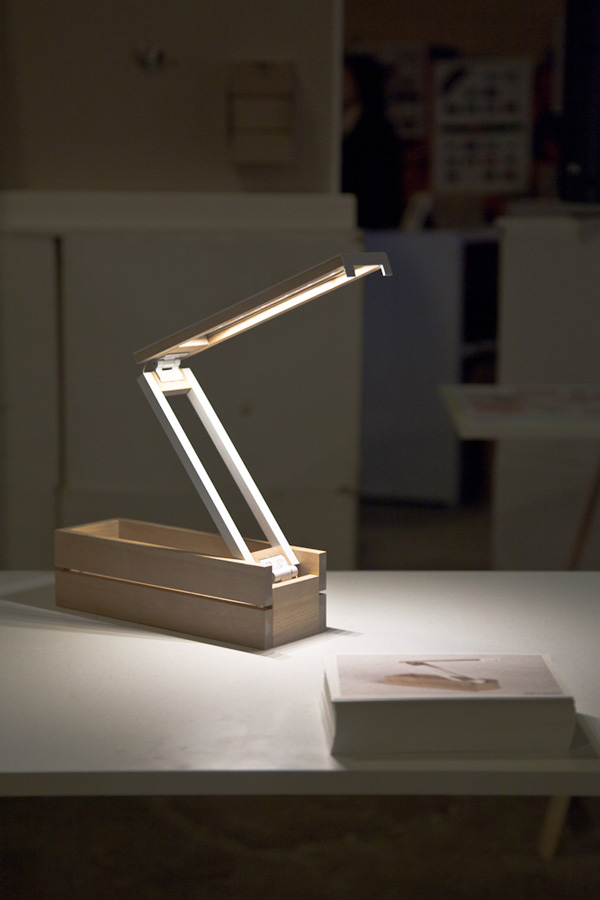 Đèn Curious có thể dùng làm đèn bàn làm việc hoặc khi gập lại thì được dùng như đèn ngủ, đồng thời giúp không gian gọn gàng hơn. Chất liệu: Gỗ bu-lô và nhôm sơn. Kích thước khi gập gọn chỉ dài 25cm, cao 7cm. Curious dùng đèn LED 2700K. – Ảnh: Linn Vandli / Stian Korntved Ruud