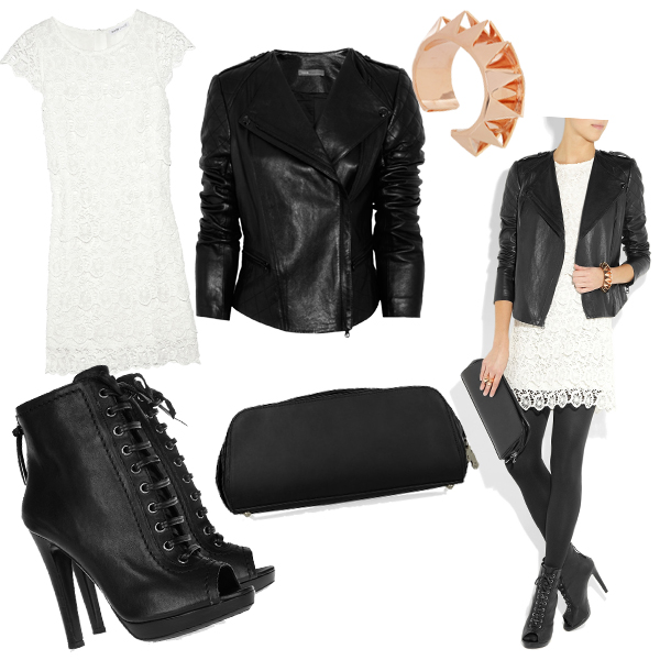 Váy See by Chloé (12 triệu đồng) màu trắng bằng chất liệu ren, có thể kết hợp cùng áo khoác da Vince (22 triệu đồng) phong cách khỏe khoắn motocross, vòng tay Eddie Borgo (10 triệu đồng) bằng vàng hồng, xắc tay Maison Martin Margiela (20 triệu đồng) phong cách cổ điển, giày boots Miu Miu (19 triệu đồng)