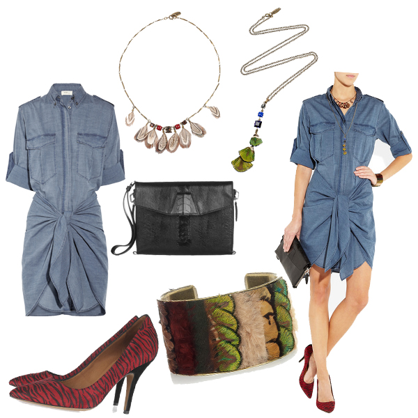 Váy jeans Étoile Isabel Marant (10 triệu đồng) cách điệu, có thể kết hợp cùng vòng cổ (từ trái qua) Isabel Marant (6 triệu đồng) và vòng cổ Isabel Marant (5 triệu đồng) dạng dài, tạo thành bộ vòng cổ đáng chú ý với họa tiết lông công, vòng tay Isabel Marant (14 triệu đồng), xắc tay Alexander Wang (12 triệu đồng) họa tiết da đà điểu, và giày Isabel Marant (16 triệu đồng) họa tiết da ngựa vằn