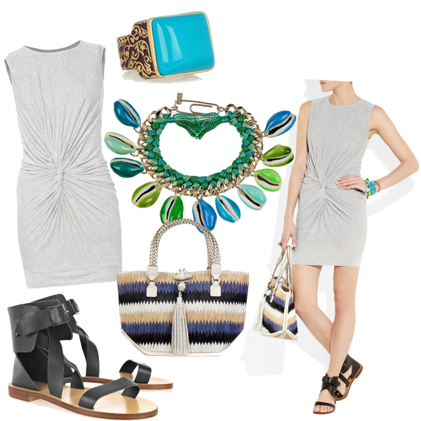 Váy thun Diane von Furstenberg (8 triệu đồng), có thể kết hợp cùng nhẫn Isharya (4 triệu đồng) màu xanh turquoise quyến rũ, vòng tay Aurélie Bidermann (28 triệu đồng) xanh biển với những mảnh sò ghép lại, túi tote Anya Hindmarch (9 triệu đồng) nhiều màu, và xăng đan da Chloé (12 triệu đồng)