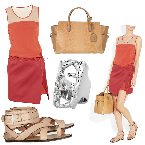 Váy Reed Krakoff (31 triệu đồng) phong cách color-block, có thể kết hợp cùng nhẫn Dominic Jones (4 triệu đồng) bằng chất liệu vàng trắng, túi tote Reed Krakoff (39 triệu đồng), và xăng đan da Reed Krakoff (14 triệu đồng)