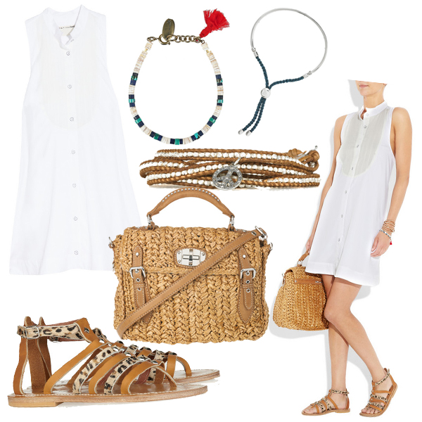 Váy trắng Rag & Bone (6 triệu đồng), có thể kết hợp cùng vòng tay (từ trái qua, từ trên xuống) Isabel Marant (2 triệu đồng), vòng tay Monica Vinader (3 triệu đồng), vòng tay Chan Luu (7 triệu đồng), túi satchel Miu Miu (32 triệu đồng), và xăng đan K Jacques St Tropez (7 triệu đồng) họa tiết da báo