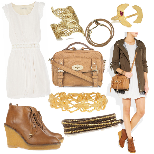 Váy trắng Sandro (8 triệu đồng), có thể kết hợp cùng nhẫn (từ trái qua, từ trên xuống) Mallarino (7 triệu đồng) họa tiết chiếc lá, nhẫn Daisy Knight (9 triệu đồng) hình trăng khuyết, nhẫn Alex Monroe (6 triệu đồng) hình kiến ấn tượng, vòng tay (từ trên xuống) Giles & Brother (3 triệu đồng), vòng tay Chan Luu (6 triệu đồng), túi Mulberry (27 triệu đồng), giày boots Marc by Marc Jacobs (7 triệu đồng)