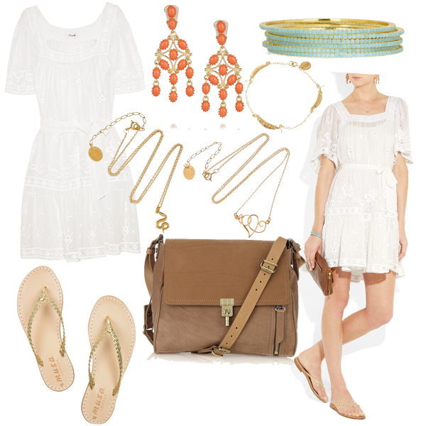 Váy Temperley London (20 triệu đồng) màu trắng xinh xắn, có thể kết hợp cùng khuyên tai Kenneth Jay Lane (3 triệu đồng) màu cam ấn tượng, vòng tay (từ trên xuống) Isharya (3 triệu đồng) màu xanh mát mắt, vòng tay Alex Monroe (4 triệu đồng) với hình quả đậu xinh xắn, vòng cổ (từ trái qua) Alex Monroe (4 triệu đồng) hình rắn, vòng cổ Alex Monroe (5 triệu đồng) hình trái tim lãng mạn, túi Lanvin (55 triệu đồng), và xăng đan Musa (5 triệu đồng)