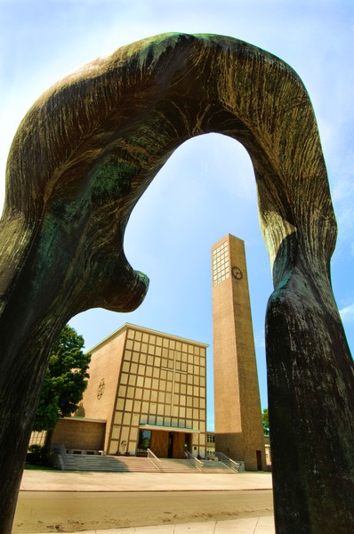 Cổng vòm lớn và Nhà thờ Thiên chúa giáo đầu tiên ở Columbis, Indiana.
