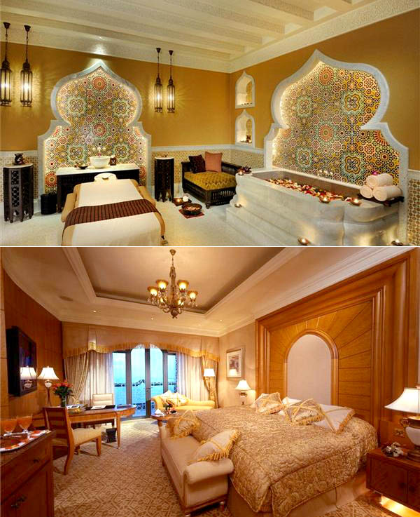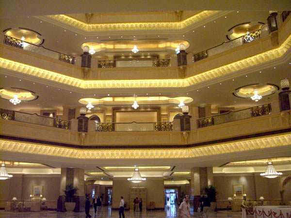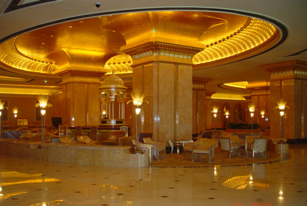 Nói về nội thất, trong lòng Emirates Palace là một thế giới cung điện khổng lồ với những nét xa hoa, lộng lẫy từ những ánh đèn trang trí đến những mái vòm được nạm vàng và đá cẩm thạch.