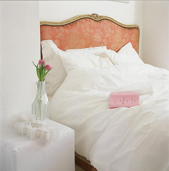 Căn phòng toàn màu trắng tinh khiết đã trông biến đổi hẳn với lớp giấy dán tường hoa lá nhẹ nhàng và sự kết hợp chấm phá của những chiếc gối hoa