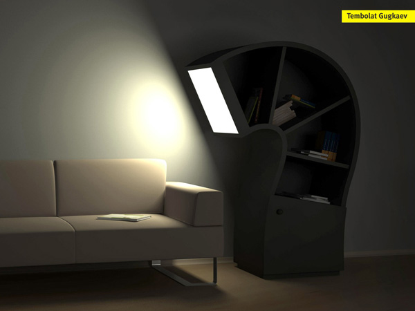 Giá sách Wha hình dấu hỏi, với đèn gắn ở đầu