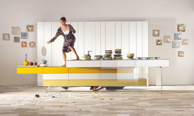 Căn bếp nữ tính nhiều sắc màu kết hợp trên màu vàng chủ chốt