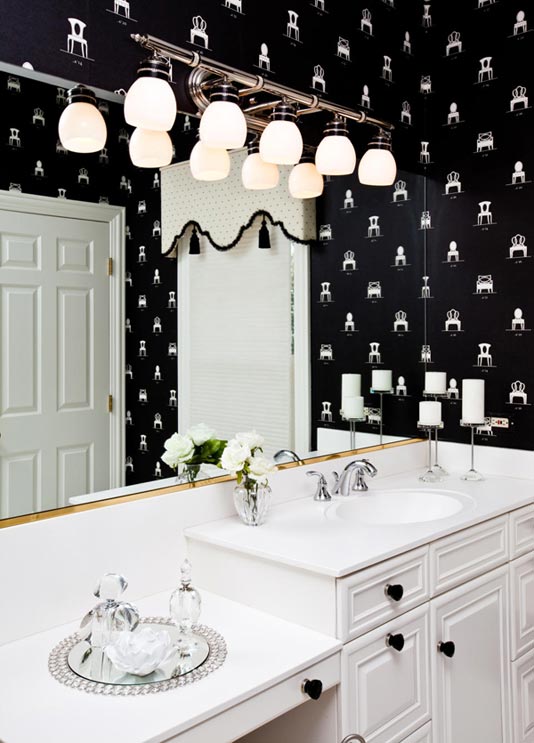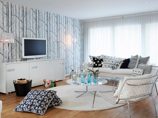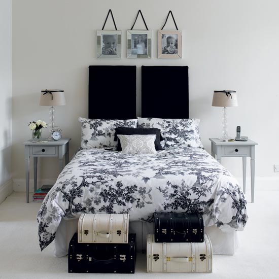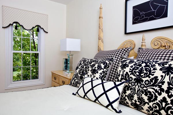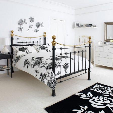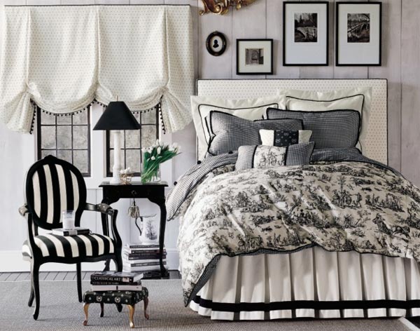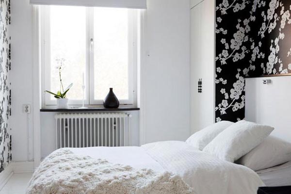 Phòng ngủ là nơi thư giãn, nghỉ ngơi sau một ngày lao động vất vả, việc ưu tiên cho màu trắng là điều hợp lí và cần thiết. Tuy nhiên, lựa chọn những nội thất có điểm màu đen như thảm trải sàn, những khung ảnh, ghế (hay một góc tường dán giấy đen họa tiết trắng nổi bật ) để bổ sung vào phòng ngủ sẽ giúp không gian có thêm đường nét và sắc màu.