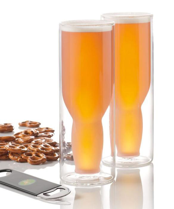 Cặp ly uống bia hai lớp thủy tinh, giúp giữ lạnh đồ uống lâu hơn các loại ly một lớp thông thường, của Brookstone được thiết kế với hình dáng độc đáo, lạ mắt.