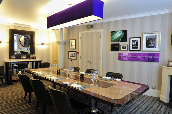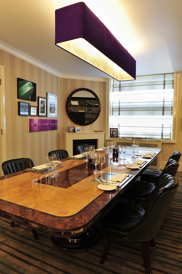 Bàn ăn và trang trí tường là đồ của Matthew Collins, công ty nội thất cao cấp được thành lập bởi hội từ thiện Prince’s Trust. Chiếc bàn được hoàn thiện với gỗ sồi (burr oak) và gỗ óc chó (burr walnut), đánh bóng véc-ni. Xung quanh bàn ăn là ghế ăn kiểu cổ điển bọc da xanh, được chế tác thủ công theo mẫu thiết kế gốc năm 1926 của Bentley.