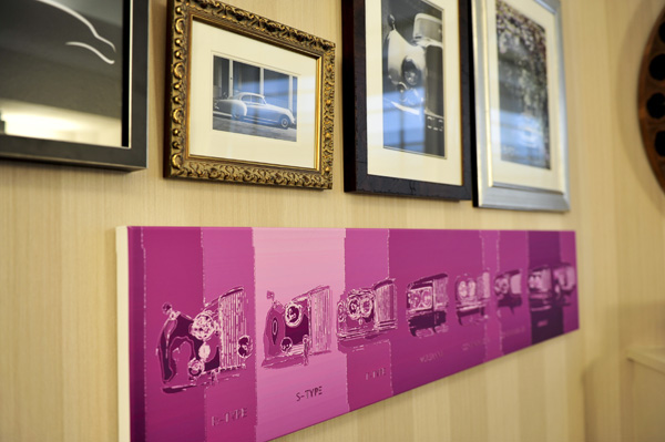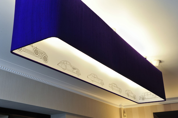 Tông màu dịu, trung tính với các điểm nhấn chi tiết lụa tím và xanh lá gợi lại cảm giác mạnh về lịch sử của một thương hiệu xe lớn, đồng thời mang đến cho căn phòng một vẻ đệp hiện đại.
