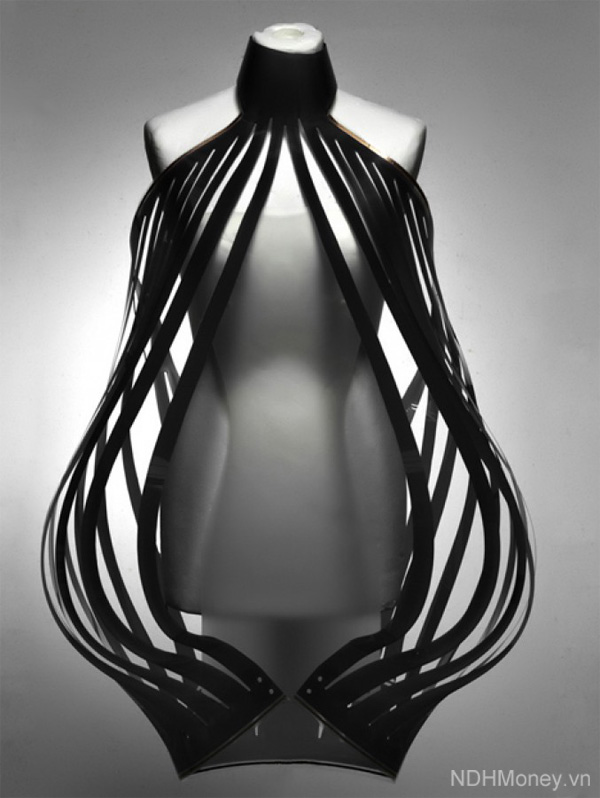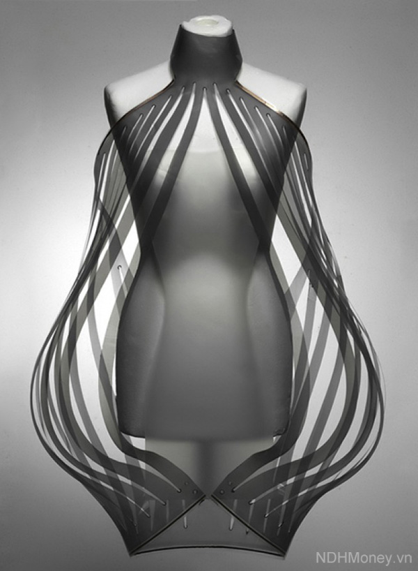 Váy Intimacy (thân mật) với kích thước dài 100cm, ngang 40cm, sử dụng vải phôi điện tử thông minh, công nghệ không dây, điện, đèn LED, đồng và các thiết bị công nghệ khác.