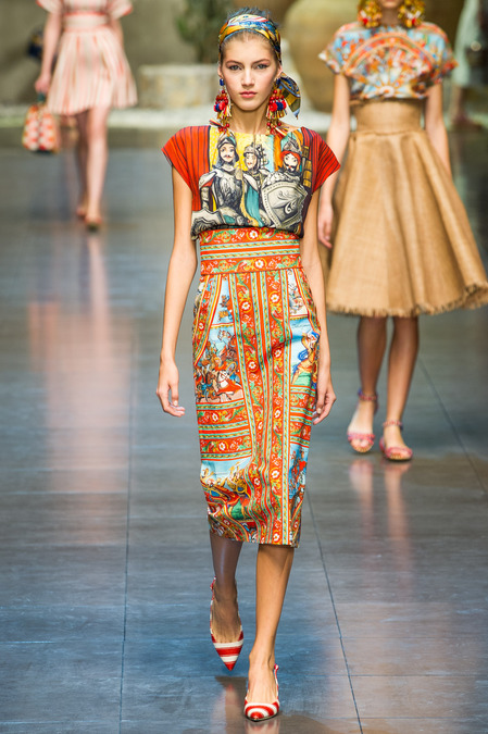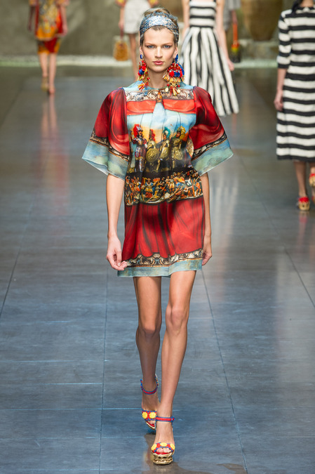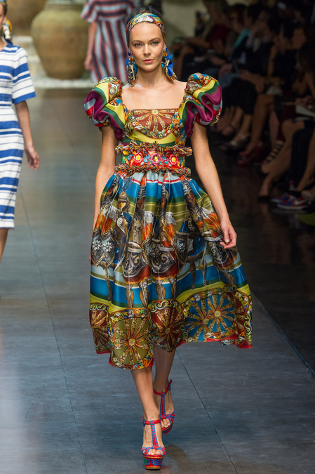 Những bộ váy lụa cao cấp được in họa tiết kẻ sọc và những chú rối đường phố, mặc cùng với khăn trùm đầu loại thường thấy trong các tiệm đồ lưu niệm tại đây, cùng khuyên tai hình những con rối của Sicily.