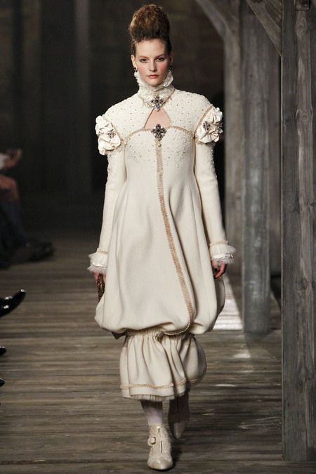 Karl Lagerfeld đã kết thúc buổi trình diễn bằng những bộ váy len trắng vương giả, được đính thêm lông vũ và ren trắng thuần khiết. Sự tôn vinh chất liệu len trong bộ sưu tập lần này còn là bởi, theo thống kê doanh số của Chanel trên toàn thế giới, thì những mẫu trang phục len của Chanel được yêu thích và mua nhiều thứ 2, xếp sau những chiếc áo khoác lịch lãm